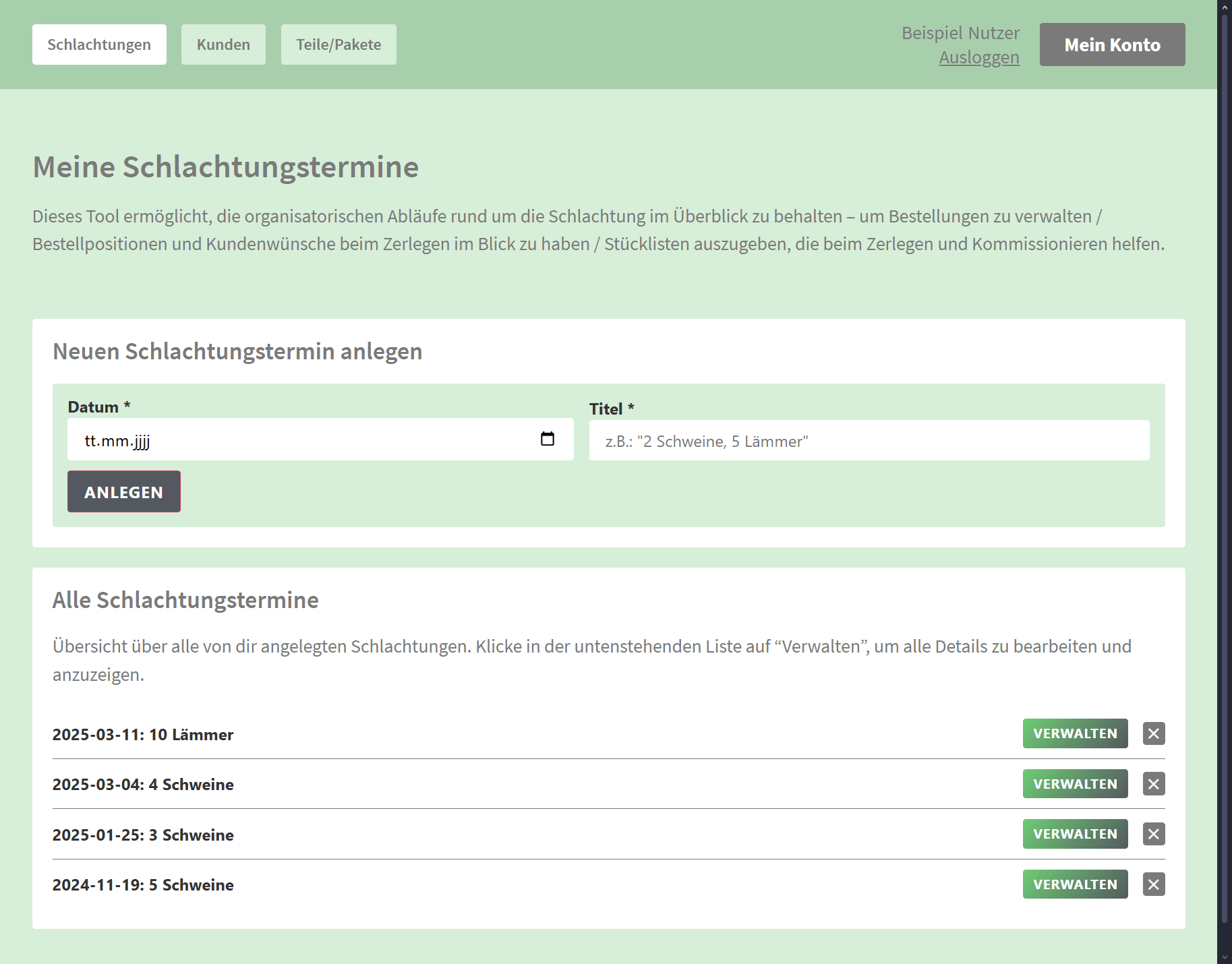 Übersicht über alle von dir angelegten Schlachtungen. Klicke in der untenstehenden Liste auf “Verwalten”, um alle Details zu bearbeiten und anzuzeigen.