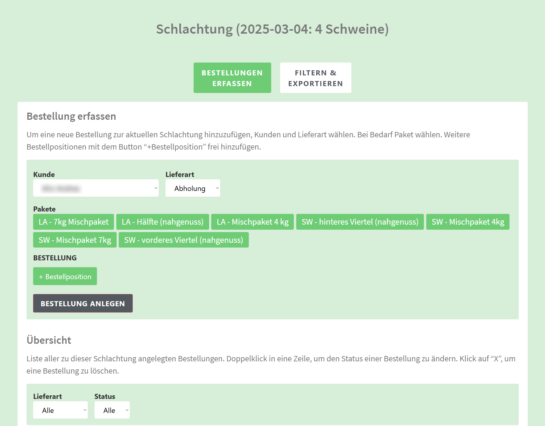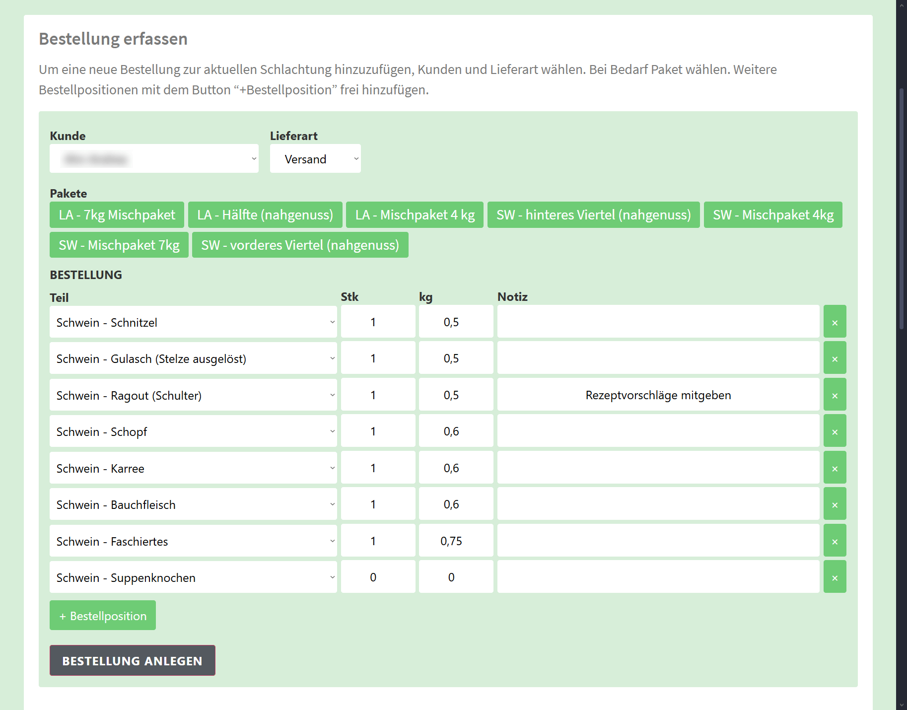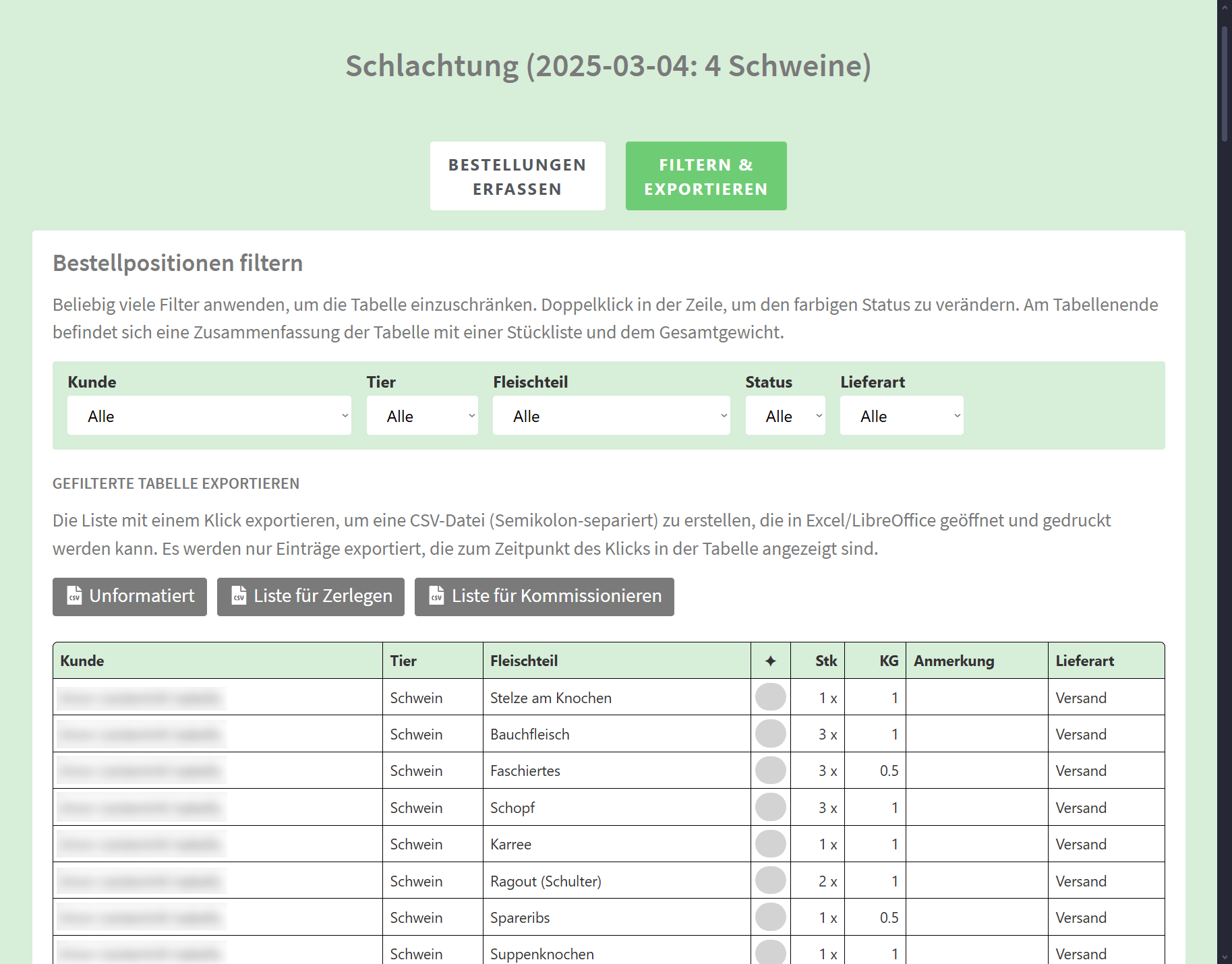 Unser Online-Tool fleischverkauf.app haben wir in unserem eigenen Betrieb entwickelt, um die organisatorischen Abläufe rund um die Schlachtung im Überblick zu behalten: Wir verwalten damit unsere Bestellungen / Bestellpositionen, haben Kundenwünsche beim Zerlegen im Blick und drucken Stücklisten, die alle Infos beinhalten, um beim Zerlegen und Einpacken nicht alles durchzählen zu müssen.