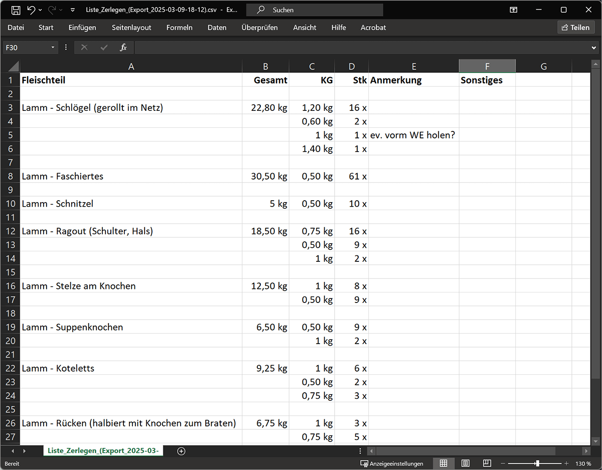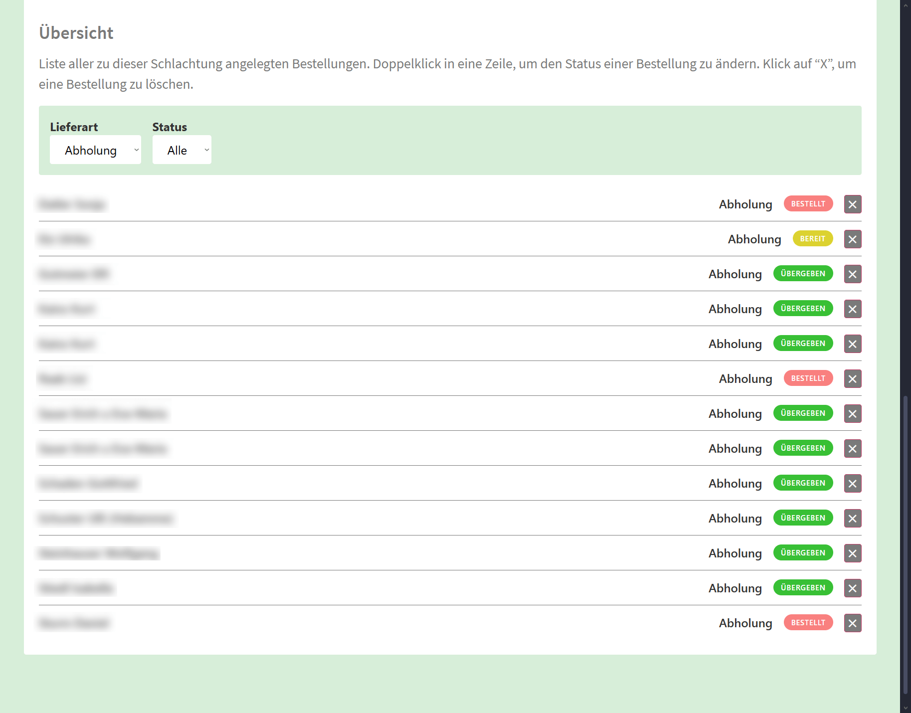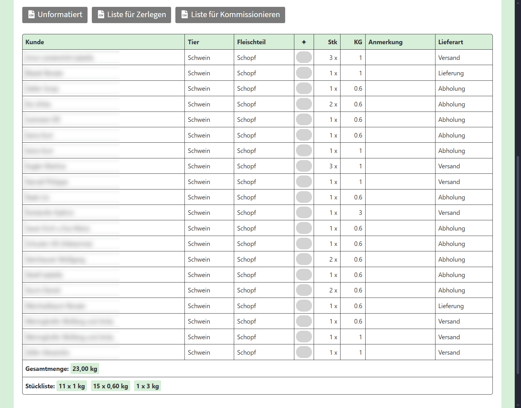 Unser Online-Tool fleischverkauf.app haben wir in unserem eigenen Betrieb entwickelt, um die organisatorischen Abläufe rund um die Schlachtung im Überblick zu behalten: Wir verwalten damit unsere Bestellungen / Bestellpositionen, haben Kundenwünsche beim Zerlegen im Blick und drucken Stücklisten, die alle Infos beinhalten, um beim Zerlegen und Einpacken nicht alles durchzählen zu müssen.